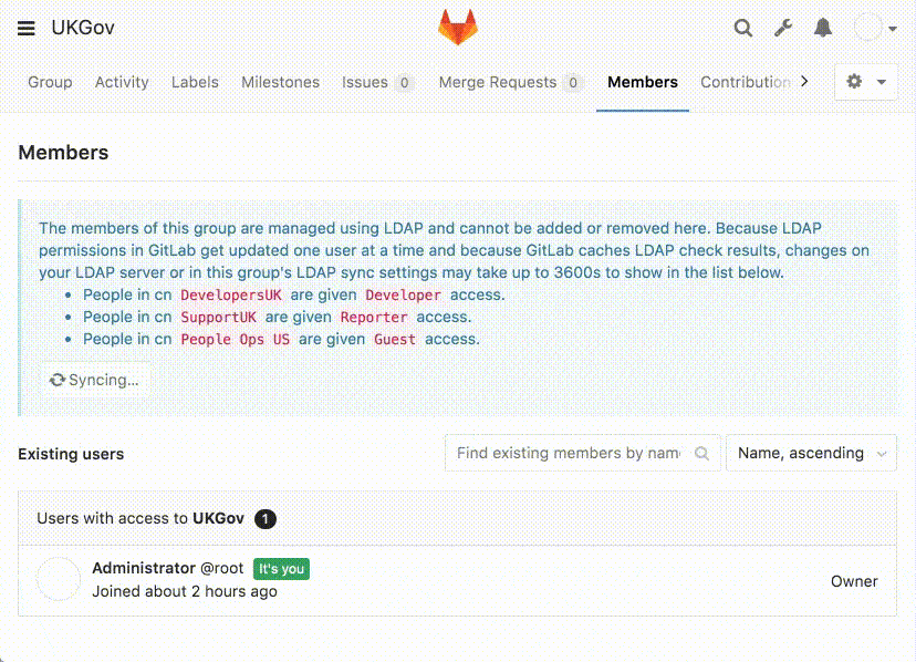 As an example, let's suppose we have a "UKGov" GitLab group, which deals with confidential government information. Therefore, it is important that users of this group are given the correct permissions to projects contained within the group. Granular group permissions can be applied based on the AD group.