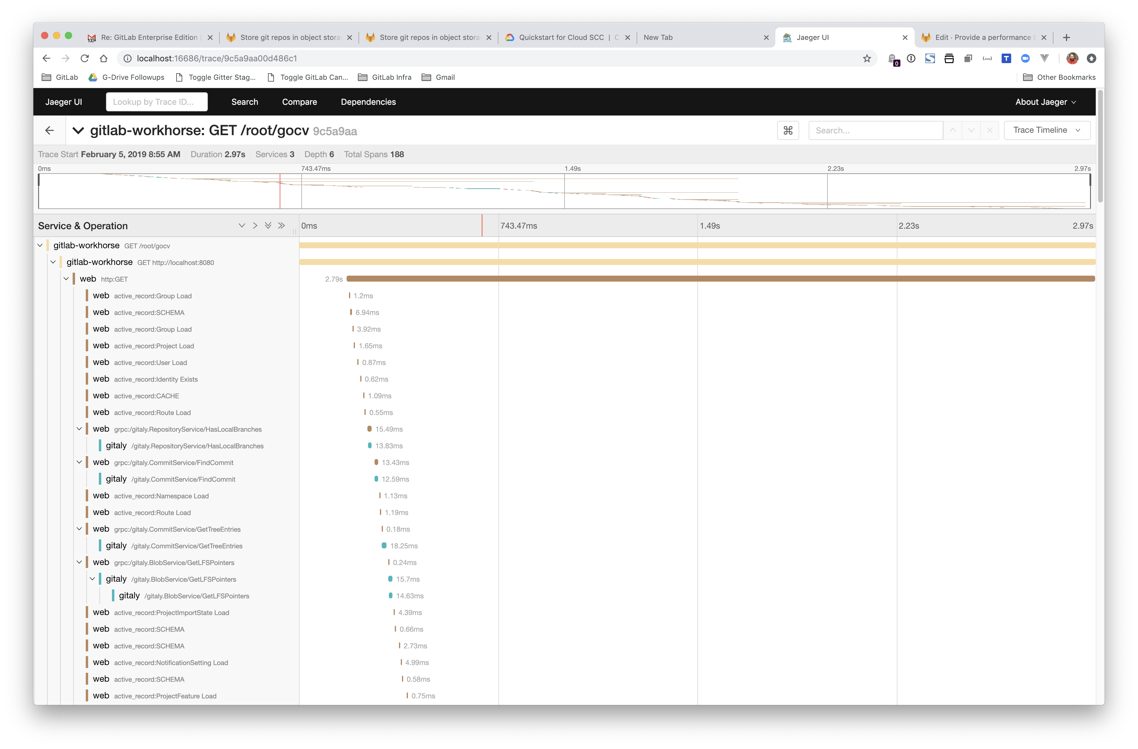The first tracing implementation that GitLab supports is Jaeger, and the GitLab Development Kit supports distributed tracing with Jaeger out-of-the-box.