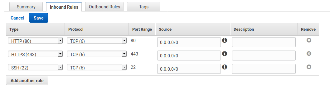 Select the security group from the list and at the bottom select the Inbound Rules tab. You will need to open the SSH, HTTP, and HTTPS ports. Set the source to
