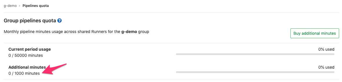 Once we have processed your payment, the extra CI minutes will be synced to your Group and you can visualize it from the Group > Settings > Pipelines quota page: