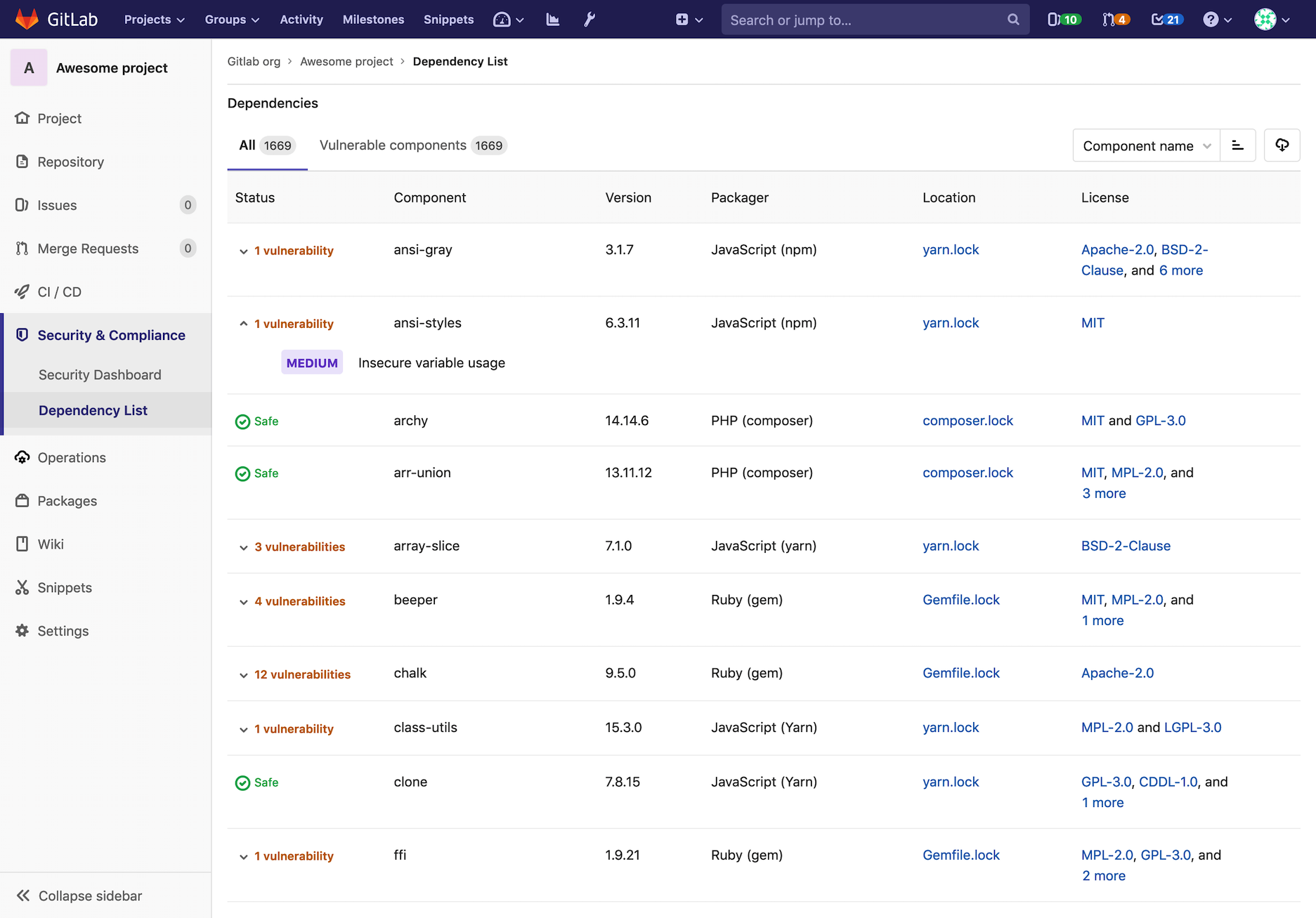 The Dependency list allows you to see your project's dependencies, and key details about them, including their known vulnerabilities. To see it, navigate to Security & Compliance > Dependency List in your project's sidebar.
