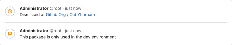 When dismissing a vulnerability, it's often helpful to provide a reason for doing so. If you press the comment button next to Dismiss vulnerability in the modal, a text box will appear, allowing you to add a comment with your dismissal. This comment can not currently be edited or removed, but future versions will add this functionality.