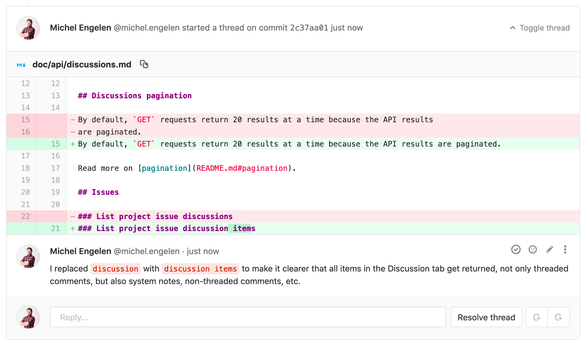 For reviewers with commit-based workflow, it may be useful to add threads to specific commit diffs in the context of a merge request. These threads will persist through a commit ID change when: