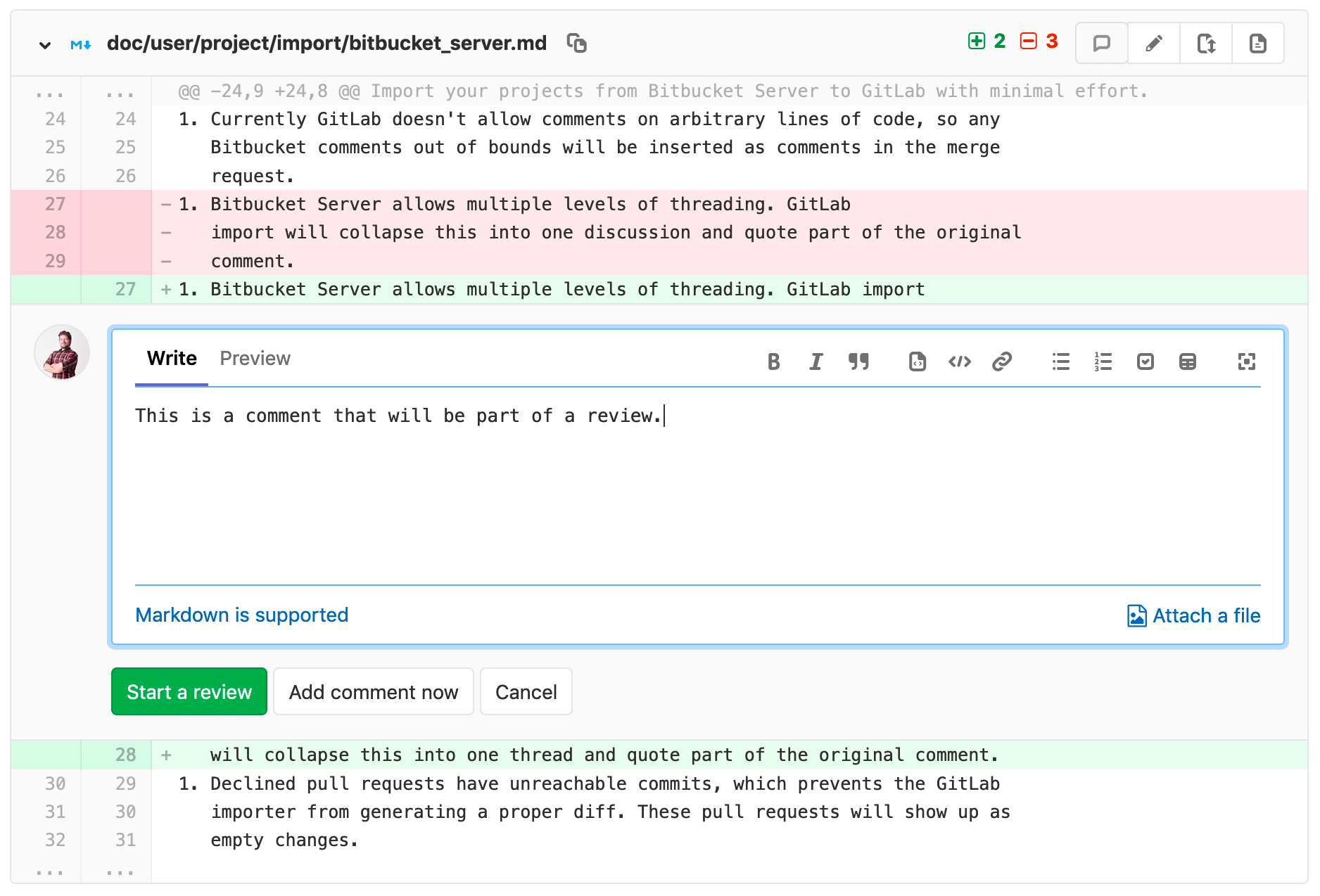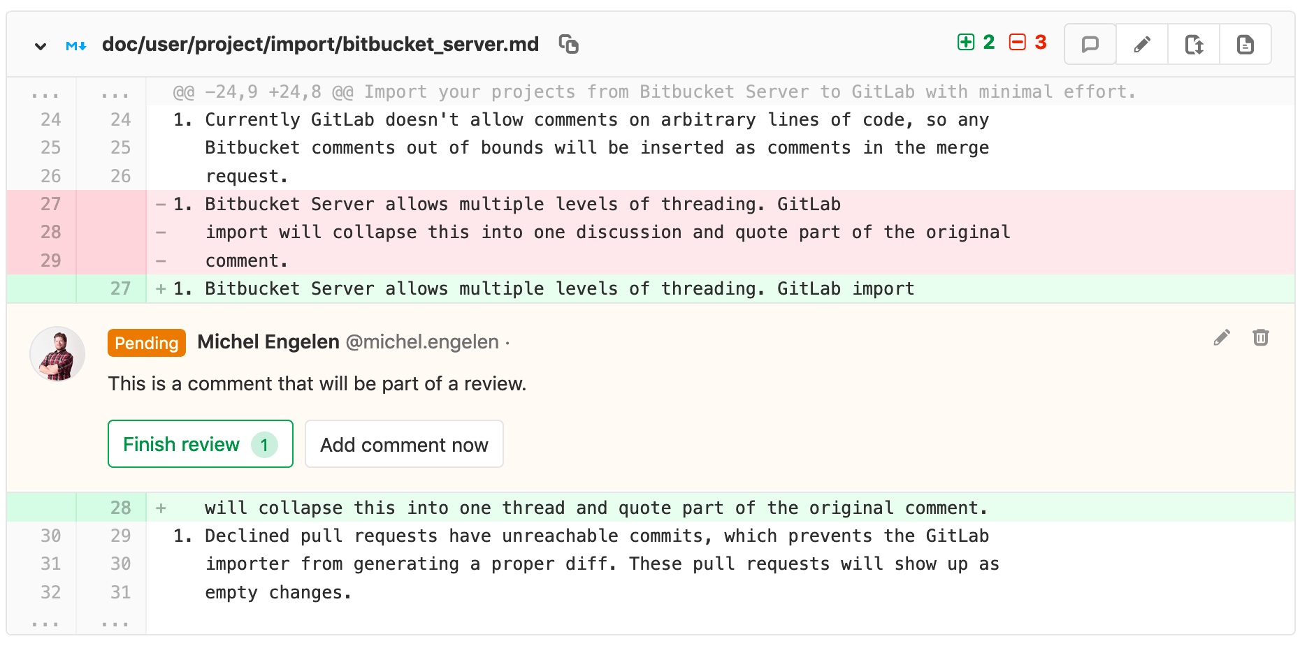 When looking at a Merge Request diff, you are able to start a review. This allows you to create comments inside a Merge Request that are only visible to you until published, in order to allow you to submit them all as a single action.