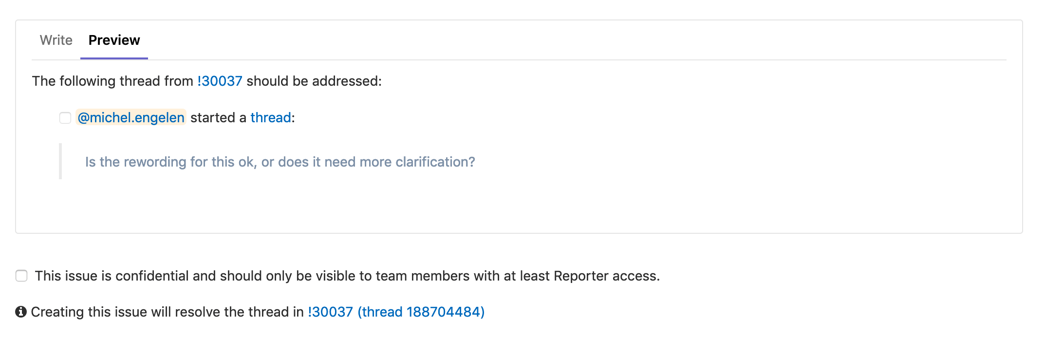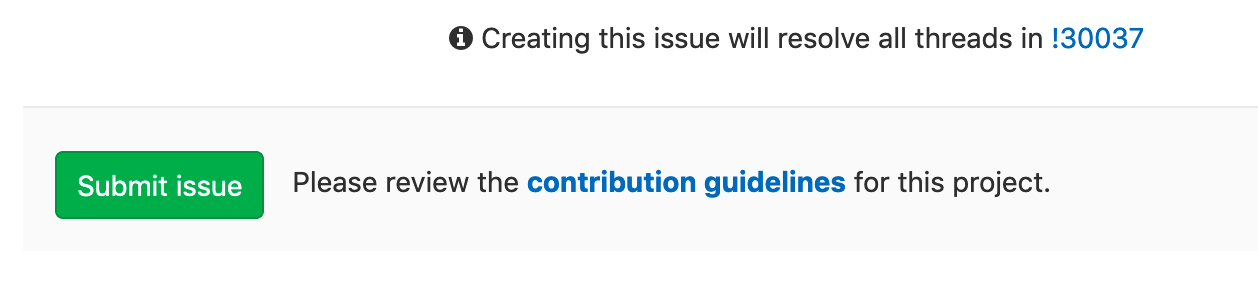 This will direct you to a new issue prefilled with the content of the thread, similar to the issues created for delegating multiple threads at once. Saving the issue will mark the thread as resolved and add a note to the merge request thread referencing the new issue.