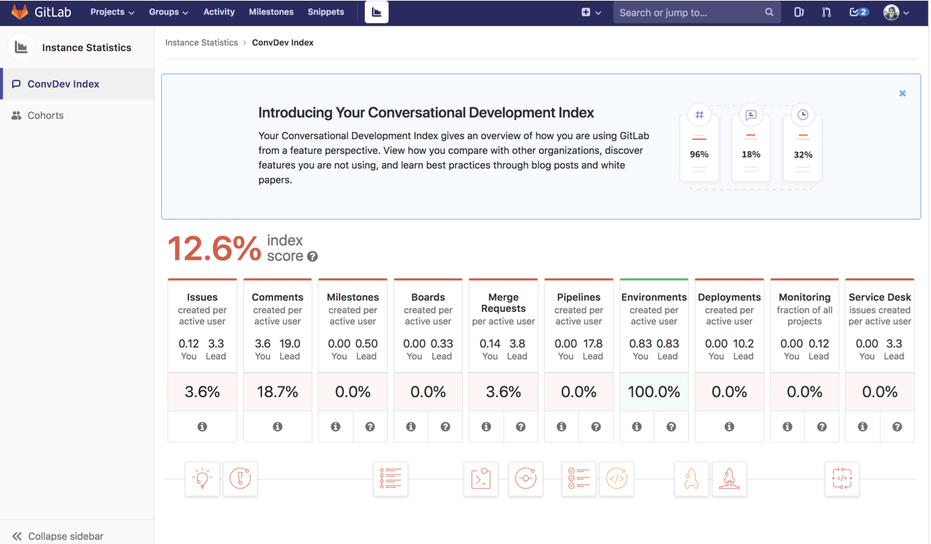 This displays the usage of these GitLab features over the last 30 days, averaged over the number of active users in that time period. It also provides a Lead score per feature, which is calculated based on GitLab's analysis of top-performing instances based on usage ping data that GitLab has collected. Your score is compared to the lead score of each feature and then expressed as a percentage at the bottom of said feature. Your overall index score is an average of all your feature score percentages - this percentage value is presented above all the of features on the page.