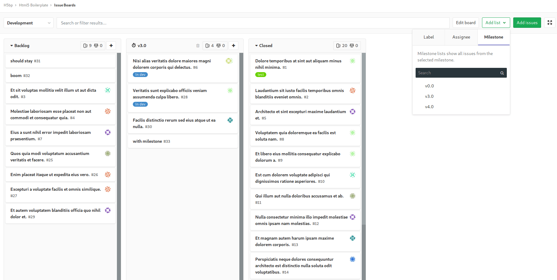 - Label list: a list based on a label. It shows all opened issues with that label.