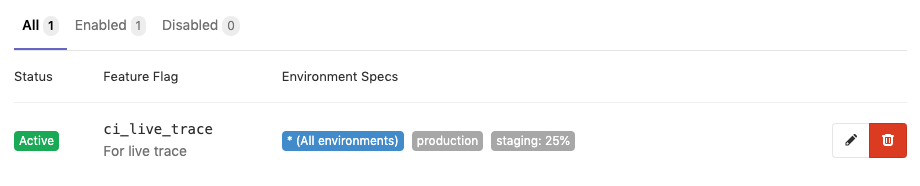 To make a feature flag active or inactive, click the pencil icon to edit it, and toggle the status for each spec.