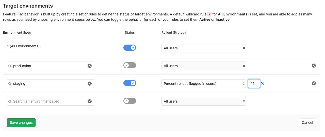 *). Choose a rollout strategy. This status and rollout strategy combination will be used for all environments. - If you want to enable/disable the feature on a specific environment, create a new spec and type the environment name.