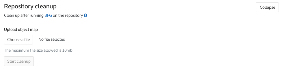 object-id-map.old-new.txtfile and press Start cleanup. This will remove any internal git references to the old commits, and rungit gcagainst the repository. You will receive an email once it has completed.