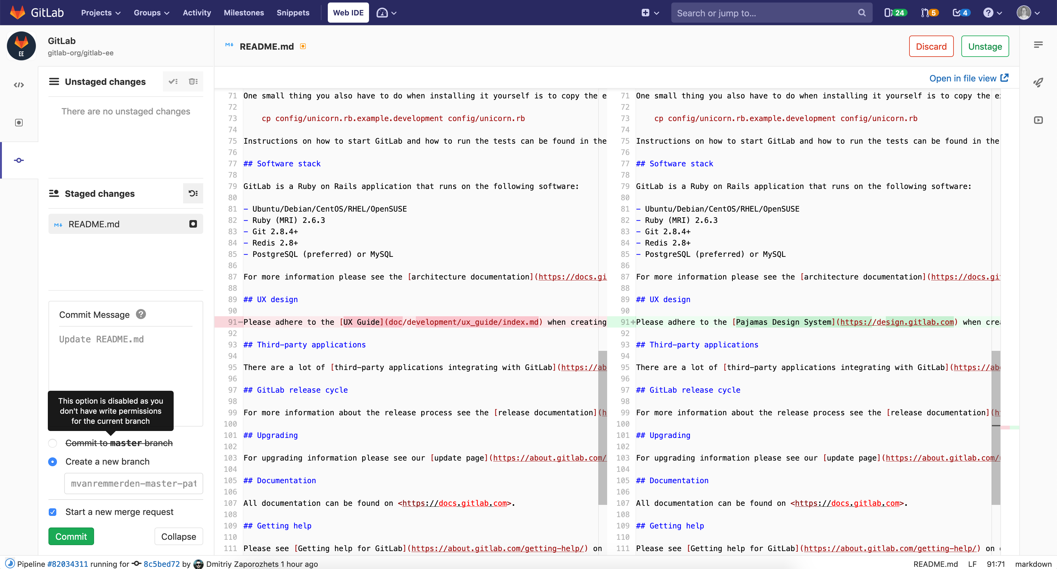 Once you have staged some changes, you can add a commit message, commit the staged changes and directly create a merge request. In case you don't have write access to the selected branch, you will see a warning, but still be able to create a new branch and start a merge request.