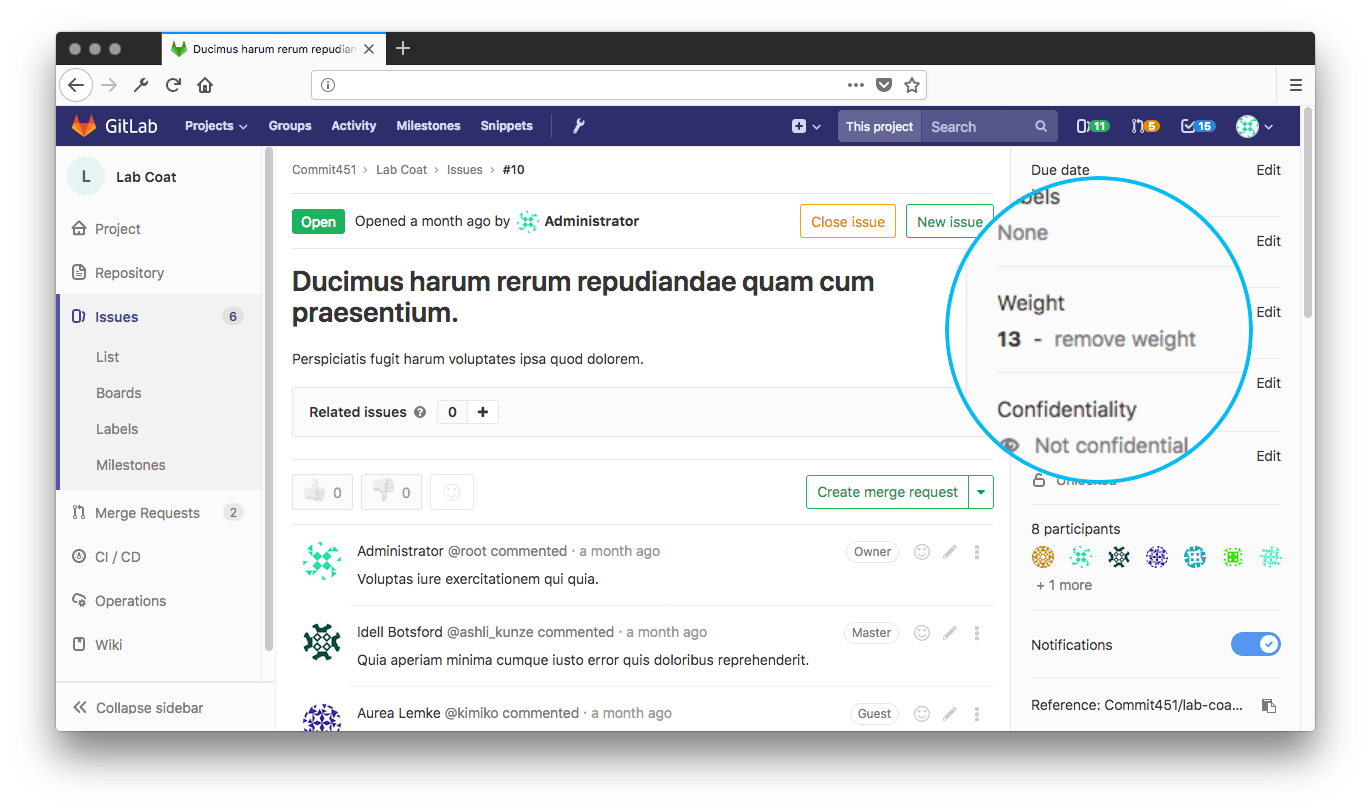 This value will appear on the right sidebar of an individual issue, as well as in the issues page next to a distinctive balance scale icon.
